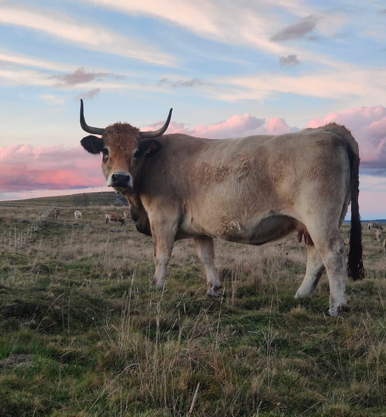 Au cœur de notre ferme, dans un parc de trente hectares, vous pouvez voir évoluer nos animaux en toute quiétude. L'élevage de vaches Aubracs est l'activité principale de notre exploitation.